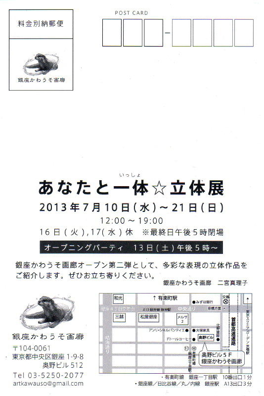 あなたと一体☆立体展・銀座かわうそ画廊 銀座かわうそ画廊 あなたと一体☆立体展 2013年7月10日(水)〜7月21日(日) 12時 〜19時 16日(火)、17日(水)休廊 ※ 最終日17時閉場 〈出品作家〉 井上菜恵子・小畑多丘・木村浩之・辻蔵人・向井正一・山崎龍一・若林真耶(50音順・敬称略) オープニングパーティー:13日(土)17時〜 銀座かわうそ画廊 〒104-0061 東京都中央区銀座1−9−8 奥野ビル512 TEL:03-5250-2077 artkawauso@gmail.com